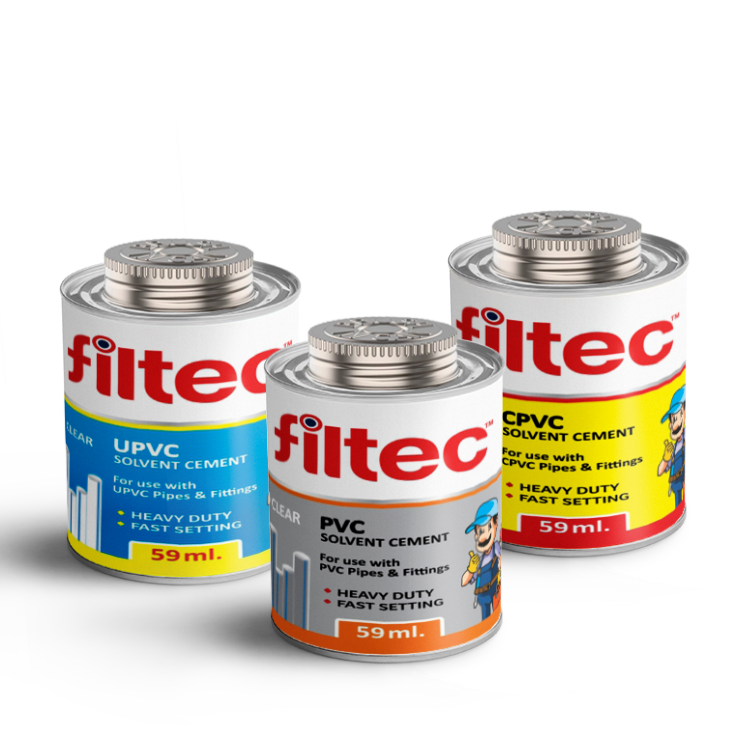 Filtec PVC Solvents are specially formulated adhesives designed for strong and leak-proof jointing of PVC pipes and fittings. Manufactured with high bonding strength, they provide quick setting and durable connections for plumbing, agriculture, and industrial applications. Filtec PVC Solvents ensure easy application, long-lasting performance, and resistance to pressure and leakage. Developed under strict quality standards, they guarantee reliable and secure pipe installations. With Filtec, you get trusted solutions for hassle-free and efficient piping systems.