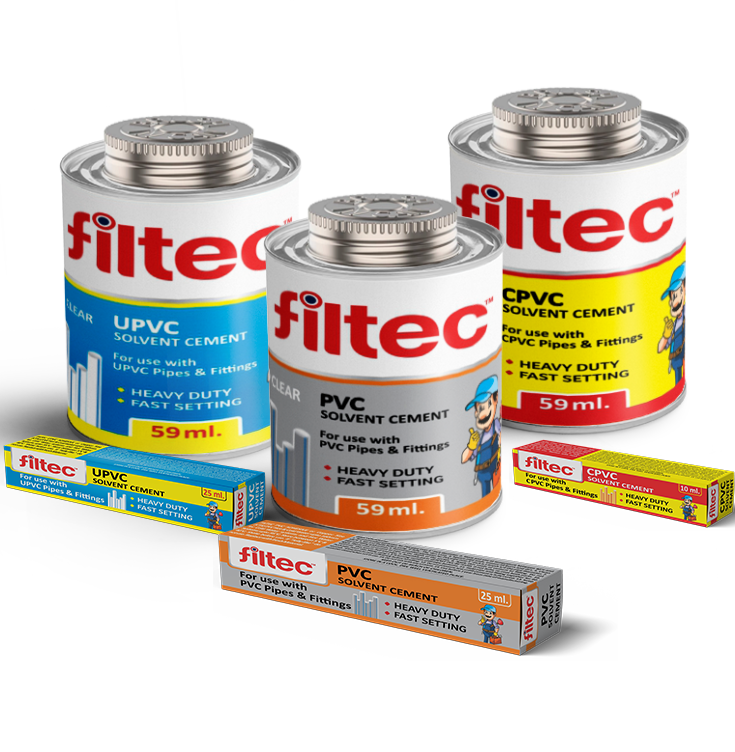 Filtec PVC Solvents are specially formulated adhesives designed for strong and leak-proof jointing of PVC pipes and fittings. Manufactured with high bonding strength, they provide quick setting and durable connections for plumbing, agriculture, and industrial applications. Filtec PVC Solvents ensure easy application, long-lasting performance, and resistance to pressure and leakage. Developed under strict quality standards, they guarantee reliable and secure pipe installations. With Filtec, you get trusted solutions for hassle-free and efficient piping systems.